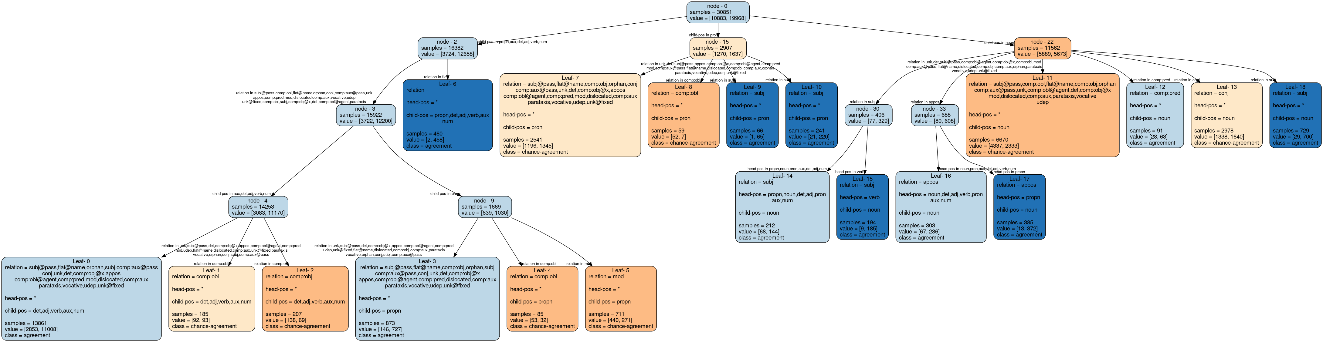 The following decision tree visualizes the rules used for classifying presence/absence of morphological agreement between two tokens that are connected by a dependency relation denoted by relation. head-pos and child-pos refer to the POS tag of the head and child token respectively.